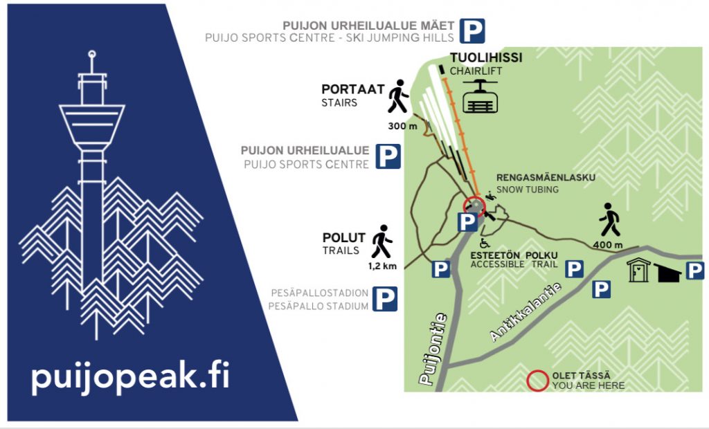 2.Autolla Puijon tornin ja Majan pihaparkkiin tai lähelle yläparkkiin, joiden välillä on kevyen liikenteen väylä. Yllä mainitut parkkipaikat sopivat liikuntarajoitteisille. Lisäksi parkkipaikkoja löytyy frisbee golf radan ja Ylä-Antikkalan laavun vierestä (katso alla kartta, jossa on Puijon P alueet), joista on valaistu reitti Puijon laelle. Paikoitus on maksutonta. Halloween polku sijaitsee esteettömällä kansipolulla, joka kiertää Puijon majan ympäri. Lähtö Majan etupuolelta! (katso alemmasta kartasta kansipolun sijainti).