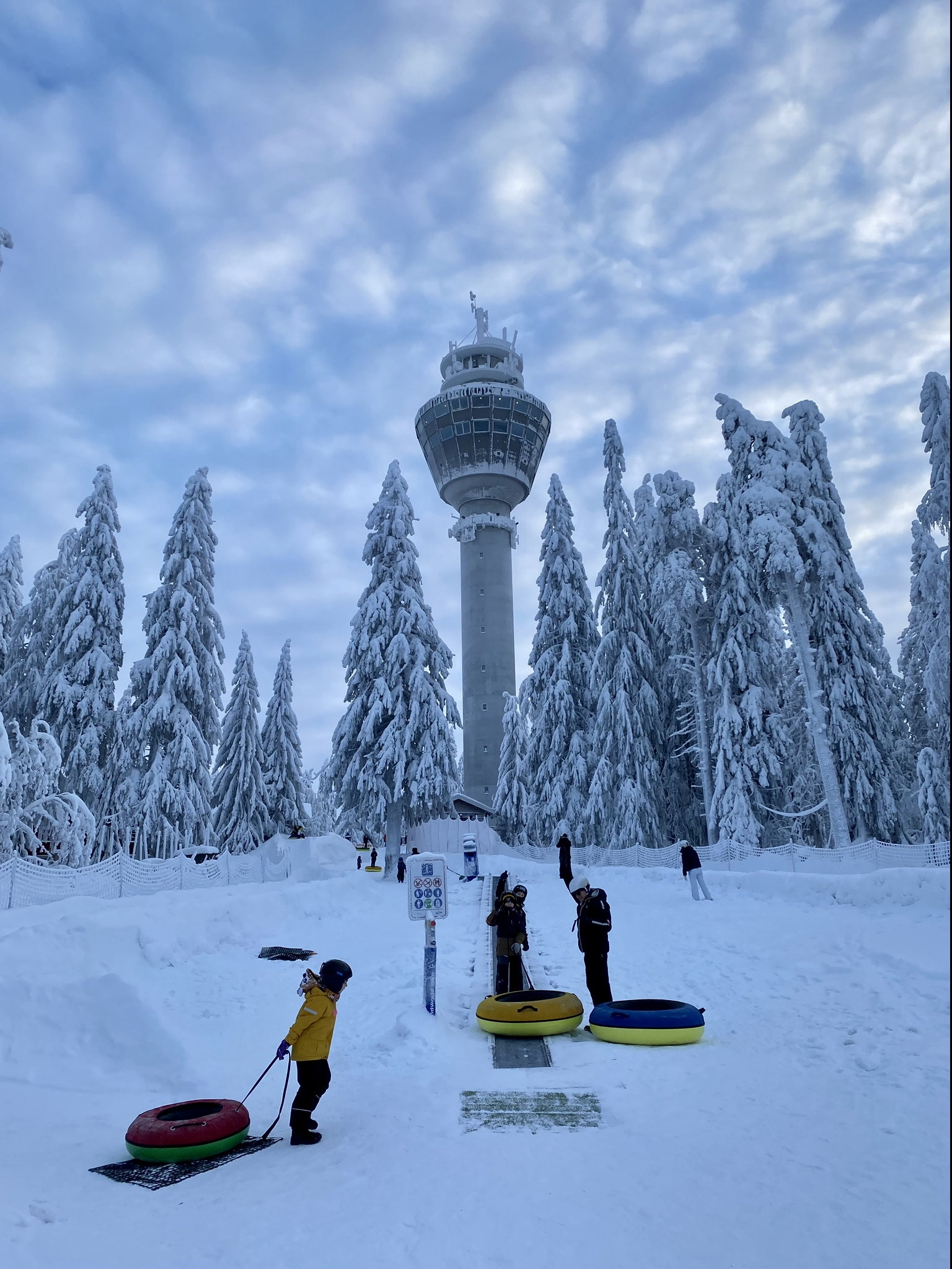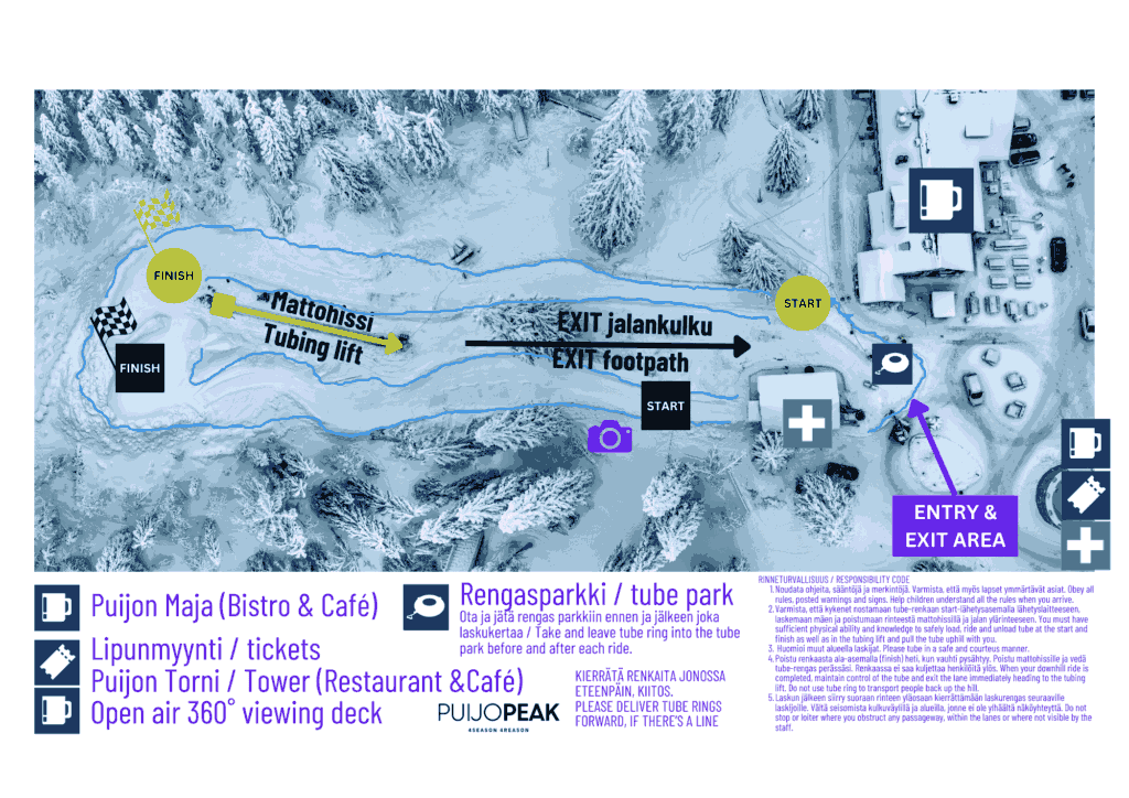 Snow Tube- alue sijaitsee heti Puijon Tornin itäpuolella avautuvalla aukiolla, jonka edessä on alueopasteet ja turvaohjeet. Vietä hetki opasteiden parissa ja lue ohjeet huolellisesti läpi.