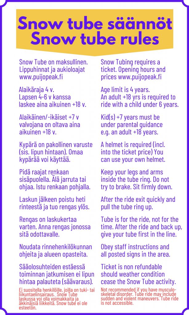 Snow Tube on painovoimaan perustuva hauskanpitoaktiviteetti, jonka olennaisena osana on sääolosuhteet ja lumi sen eri muodoissaan. Rinnealue on jatkuvasti muuttuva ja huollamme sekä tarkkailemme sitä koko ajan. Snow Tube mäenlaskussa laskurengas voi liikkua äkillisesti ja voimakkaasti, joten emme suosittele aktiviteettia henkilöille, joilla on tuki- tai liikuntaelinsairaus tai -kipuja. Snow Tube ei ole esteetön. Turvallisuudestasi huolehdit parhaiten, kun noudatat annettuja ohjeita, alueen opasteita ja määräyksiä sekä rinnehenkilökunnan ohjeita. Jokainen laskee snow tubessa ja oleskelee alueella omalla vastuullaan ja aikuiset vastaavat mukanaan olevista alaikäisistä.